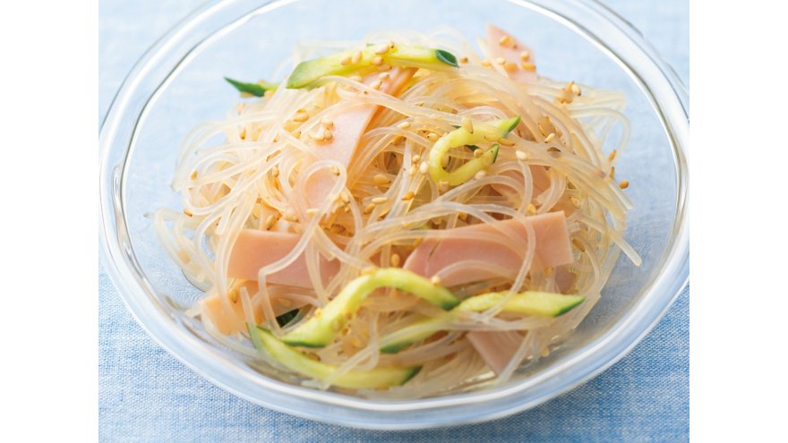春雨はざるに上げてしっかりと湯をきり、熱いうちに1のボウルに加えて混ぜる。全体がなじんだらきゅうり、ハム、白ごまを加えて混ぜる。
