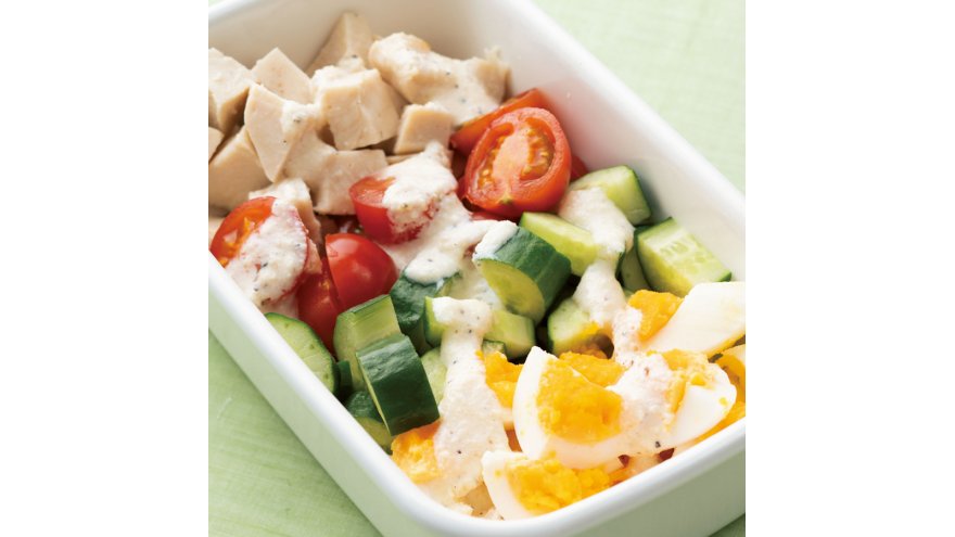ゆで卵、サラダチキンは1.5cm角に切る。ミニトマトは縦半分に切る。きゅうりは1cm厚さの半月形に切る。