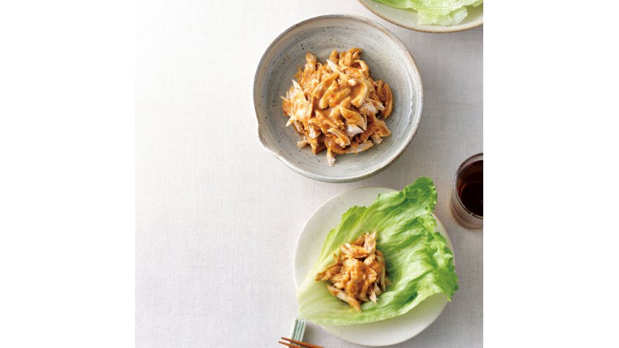 電子レンジで手軽に蒸したささ身に、バンバンジー風のピリ辛ごまだれをからめます。レタスで包めば、サラダ感覚の中華おかずのでき上がり。