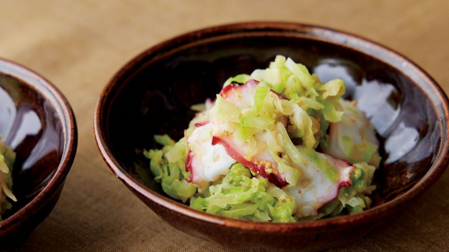 鍋に湯を沸かしてキャベツを入れ、再び沸いたらみょうがを加え、サッとゆでてざるに上げる。粗熱を取り、水けを絞る。ゆでだこは薄切りにする。