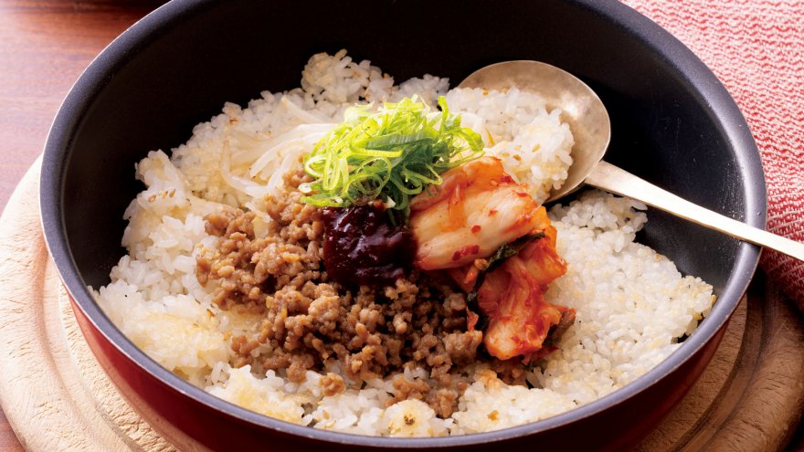 立ち上る香りと湯気に楽しさが広がる、石焼きビビンバ風の一品をどうぞ。好みでコチュジャンを混ぜ込み、辛さを調節して楽しんでください。取り分けて食べても、フライパンのまま食卓に出しても◎。