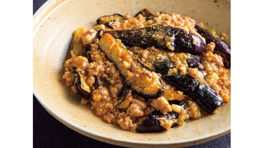 フライパンに油大さじ2を弱めの中火で熱し、なすを入れて4~5分間炒める。柔らかくなったら、火を止めて取り出す。油大さじ1/2を足して再び弱めの中火にかけ、にんにくとしょうがを約1分間炒める。ひき肉を加え、ほぐしながら炒めて火を通す。