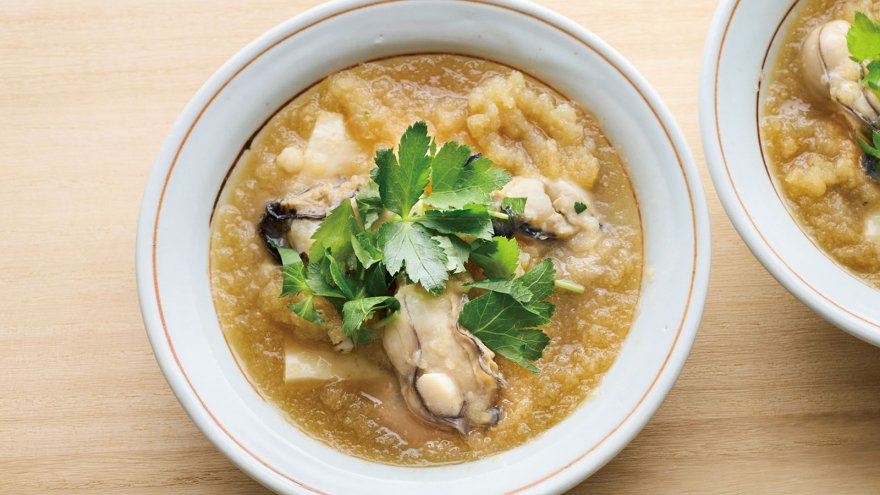 大根おろしの汁けが煮汁になる。調味料を混ぜ、豆腐とかきが隠れるくらいたっぷりとのせる。