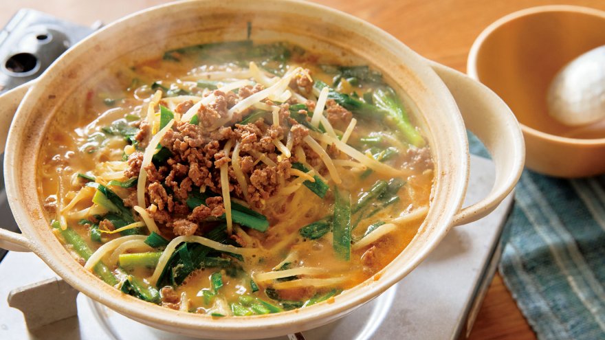 中華で人気の担々麺を鍋物にアレンジしました。もやしとにらが山盛りですが、やがてしんなり。ペロリといけます!