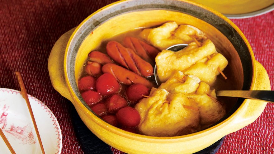 いつもの煮汁で洋風の具を楽しむ、「新」感覚のおでん鍋。ミニトマトはひと手間かけて湯むきすると、煮汁がジュワッとしみ込みますよ。
