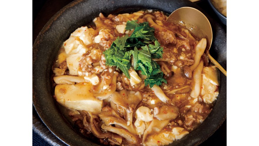 きのこのうまみをたっぷり楽しめる、塩味のマーボー豆腐。青じそは手でちぎると香りが際立ちます。