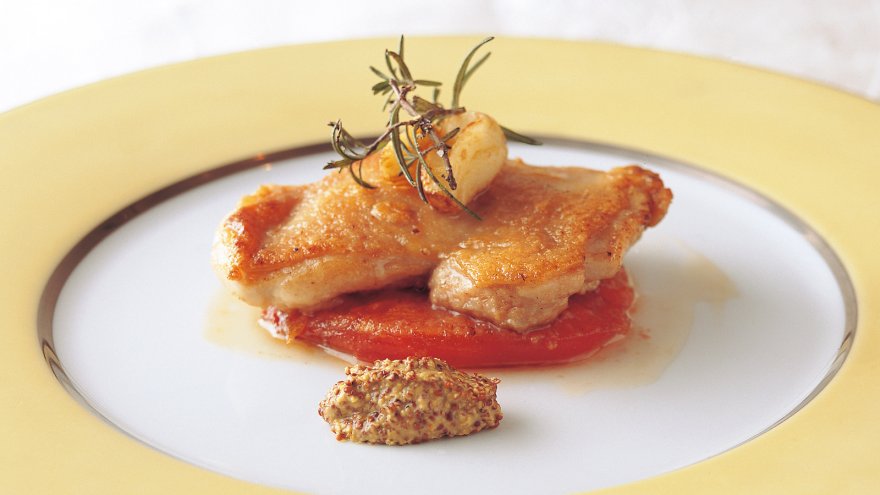 片面が色よく焼けたらトマトを裏返し、十分に柔らかくなるまで火を通す。器にトマトを敷いて鶏肉を盛り、粒マスタードを添える。生のローズマリー少々(分量外)をあしらう。