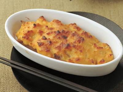 グラタン皿に2を並べ入れ、3の【肉みそ】を全体にかけ、オーブントースターでこんがりときつね色に焼き色がつき、香りがたつまで焼く。