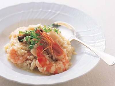 パエリアで使った材料を流用した海鮮リゾット。仕上げの火加減がこつ。