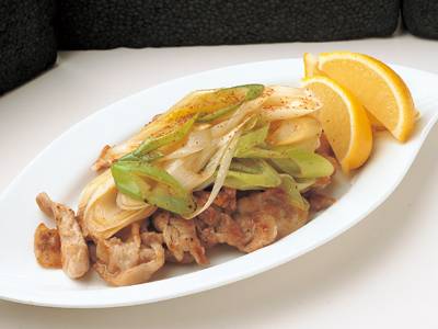 豚肉は大きいものは一口大に切る。ざっと広げて塩・こしょう各少々、酒大さじ1をふる。ねぎは斜め薄切りにする。レモンはくし形に切る。