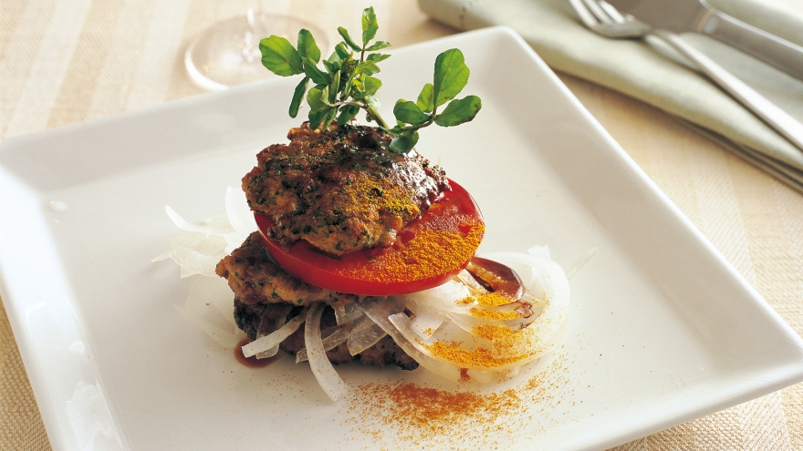 器に4のハンバーグを1枚盛り、3のたまねぎの約半量をのせ、4をもう1枚重ねる。トマト1枚をのせ、さらに4を1枚重ねて、茶こしでカレー粉をふりかける。クレソンをあしらい、残りの2をかける。同様にもう一皿盛りつける。