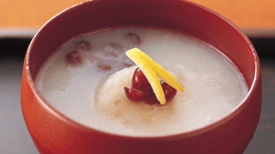 2の汁を弱火で温め、4のだんごの上にかける。ゆで小豆を等分にのせ、あれば、ゆずの皮を松葉の形に切って飾る。