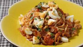 昆布だしでスパゲッティをゆでてうまみをプラス。シンプルなソースで素材の味を引き立てます。