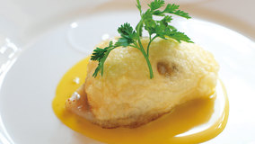 全国有数の漁獲量を誇る青森のひらめは、青森県の県魚です。陸奥湾の帆立てと一緒にづけにして、青森の米を使ったイタリア風サラダ(インサラータ)にのせます。