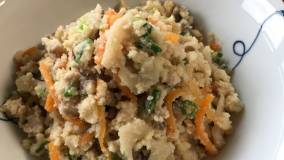 おからパウダーに材料を混ぜるだけで、軽やかなポテトサラダ風になります。加える水や調味料の量と順番がポイントです。