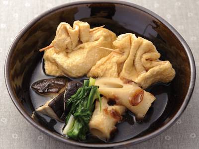 切り干し大根とひじきのおいしさがじゅわっとしみ出るきんちゃく煮。油揚げの中には肉も入って、ボリューム満点。おでんの具にもおすすめです。