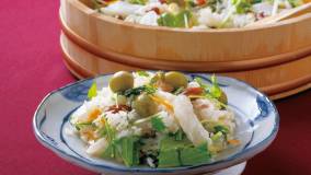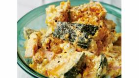 彩りのよい具材を炒め合わせることで、味も見た目もよくなる混ぜご飯。レンジでつくるかぼちゃの煮物や、卵のおかずで満足度も上がります。