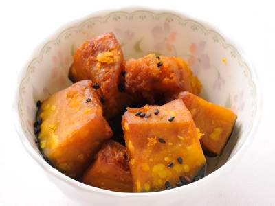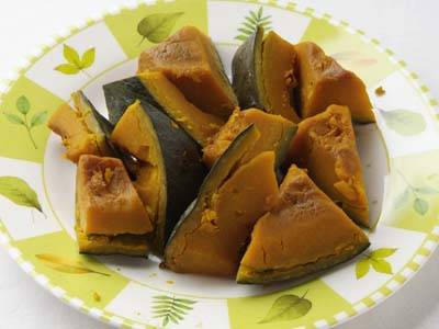 かぼちゃは、電子レンジと相性のよい野菜ナンバーワン。煮るよりホクホクとして甘く、バターじょうゆもよくなじみます。