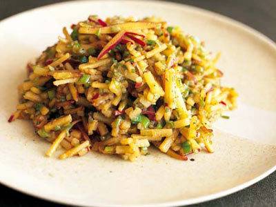 ホクホクのさつまいもを炊き込んだご飯に塩昆布を混ぜたらでき上がり。甘みと塩けのバランスが程よく、ついついおかわりをしてしまいそう。