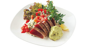 豆腐とアボカドが出会って、魅力的なディップソースが生まれました。たたきはわさびじょうゆ風味で、絶妙な和洋ミックスの味を楽しんで。