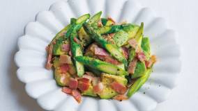 定番のアスパラ&ベーコンにアボカドを合わせ、ご飯がすすむしょうゆ風味のおかずに仕立てました。下ゆでせずにアスパラを炒めて、香りと歯ざわりを生かします。ゆでる時間も手間もはぶけて一石二鳥!