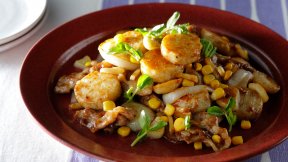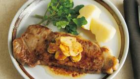 チキンソテーをきのことさらに軽くソテー。きのこはゆっくりいためてうまみを引き出し、にんにくをきかせます。