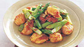 たたいたアスパラガスと卵をからめた麩をいためます。麩の食感と、コンビーフが新しい出会い。