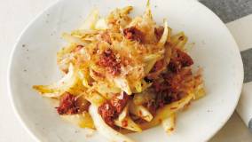 スパイシーなウスターソースが春キャベツの甘みを引き立てます。硬い軸や芯も薄切りにして全部いただきます。