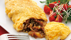 炒めた具をたっぷりと包んだボリュームオムレツ。コンビーフのうまみと塩けが効いています。