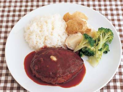 きのこソースが香る和風ハンバーグ。かむ力の弱くなったお年寄りも家族といっしょに食べることができます。