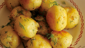 表面を焼いたら少なめのスープを加え、新じゃがをほっくりと蒸し煮に。レモンの酸味でさっぱりと仕上がります。