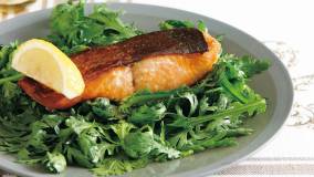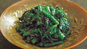 塩もみした春菊のおいしさにびっくり!わさびの辛みと風味がオリーブ油によく合います。