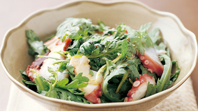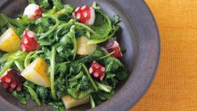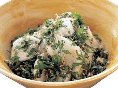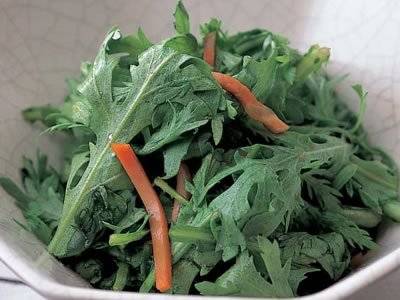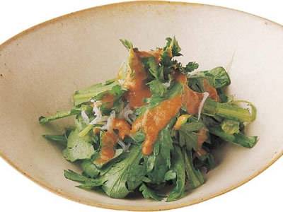 切りごまを使ったあえ物を「朝地あえ」と呼びます。春菊とせり、それぞれの香りと苦味を生かして、春ならではの味に仕上げましょう。