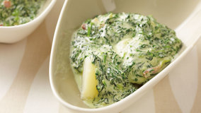 粉ふきにしたじゃがいもに、チーズクリームのミルキーなソースをたっぷりかけて。春菊の風味がさわやかさをプラス。