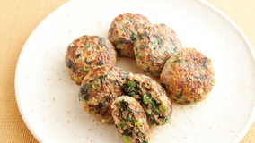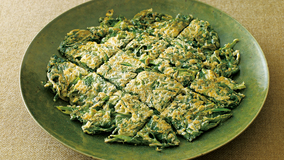 チヂミは韓国のお好み焼き、薄く焼き上げるのが特徴。春菊のすっきりとした香りとじゃこのうまみで、個性的な一品に。