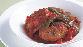 大きなパプリカと小さなピーマンにギュッとお肉を詰めて、やさしい和風だしで煮込みます。マッシュポテトを添えて、和洋の組み合わせをお楽しみください。