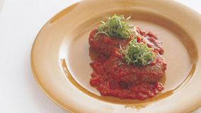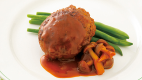 ハンバーグの肉ダネでつくるアレンジレシピです。多めの油でカリッと揚げ焼きにし、うまみを閉じ込めてから煮込んでいきます。