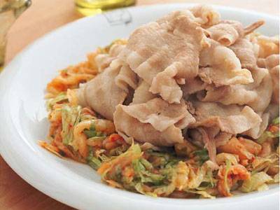 アツアツのドレッシングを生野菜にからめていただきます。豚肉のうまみと香ばしさで満足度できるおかずサラダです。