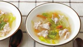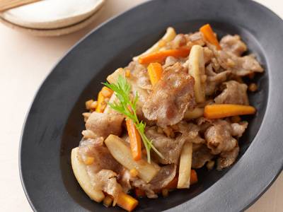 れんこんは半分に分けて、具材&煮汁のとろみづけにダブルで活用。食感や風味の違いを存分に楽しめるよう、豚肉は口当たりのやさしいしゃぶしゃぶ用で。