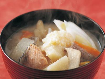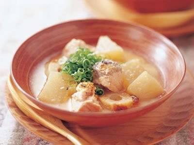 塩ざけと野菜の具だくさんの汁物です。煮立てすぎないことがコツです。