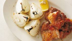 魚焼きグリルで焼いた鶏肉は絶品!余分な脂が落ちるので皮はパリパリ、身は程よくしまってうまみがしっかり味わえます。丸ごとのにんにくも一緒に焼いて付け合わせに。