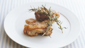 オリーブ油にローズマリーの香りを移して、鶏肉をカリッと焼き上げるのがポイント。にんにくの風味も豊かな一品です。