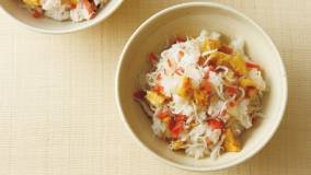 しいたけに肉入りのえび団子をのせて蒸すだけ。蒸したら、彩りよくのせた野菜に、熱したごま油をかけて香りよく仕上げましょう。