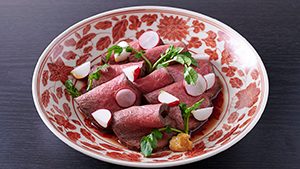 蒸した鶏の表面をパリっと焼き、中はうまみを閉じ込めて柔らかく。せん切り野菜がよく合います。