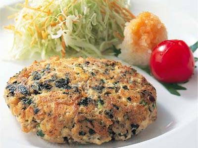 厚揚げと混ぜてさっぱり和風の手間なしハンバーグ。梅干し、ちりめんじゃこ、わかめを混ぜる「梅じゃこわかめ」だけが味つけです。