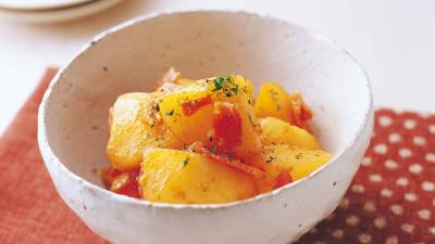 甘辛く味つけしたじゃがいもの料理に、カリカリに焼いたベーコンのコクとうまみを足した、新しいレシピです。