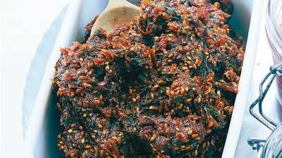 赤とうがらしに、にんにくを加えて奥行きのある辛さに。鍋つゆに味をつけてあるので、つけだれは不要です。