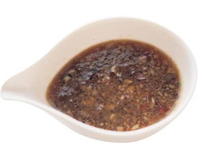 市販のポンスじょうゆとオリーブ油を混ぜ、たまねぎやむら芽をたっぷりと混ぜて香りを移したもの。