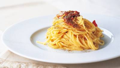 シンプルなパスタなので、香り高く仕上げることが大事。ゆでたじゃがいもやさやいんげんを加えてもいいでしょう。