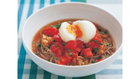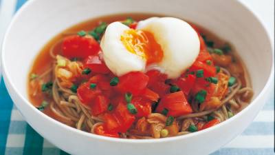 トマトの酸味とキムチの辛さ、温泉卵のまろやかさが溶け合って、満足度抜群の冷たいそばです。